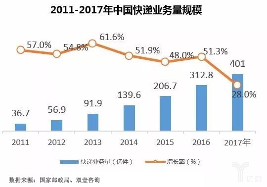 近六年以来,快递行业保持了高速的发展态势。快递业务量从2011年的36.7亿件,增长到2017年的401亿件,日均快件量从约1000万件增长到超过1亿件,人均快件使用量从不到3件增长到29件。从绝对量上来看,6年时间,快递业务量实现了10倍的增长,积累了较大基数。因此,虽然2017年快递业务量仍有88亿件的较大增长,但面对巨大的业务基数,快递业务增长率必然会放缓。