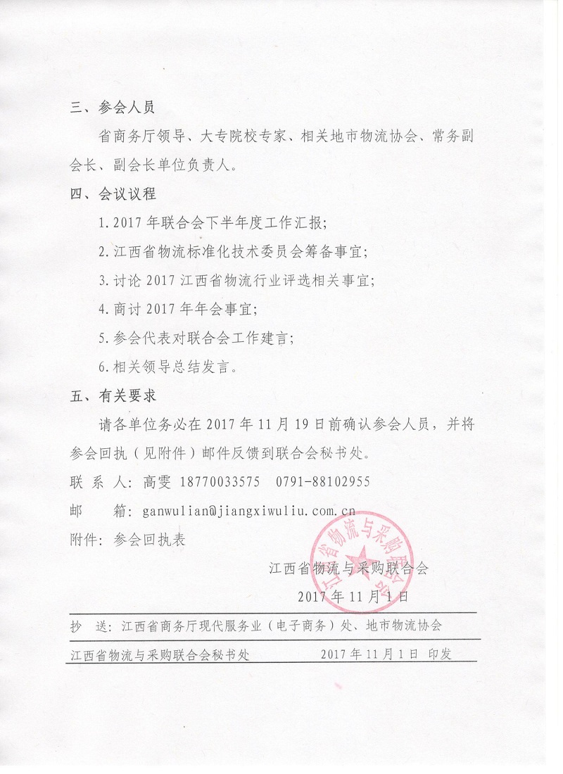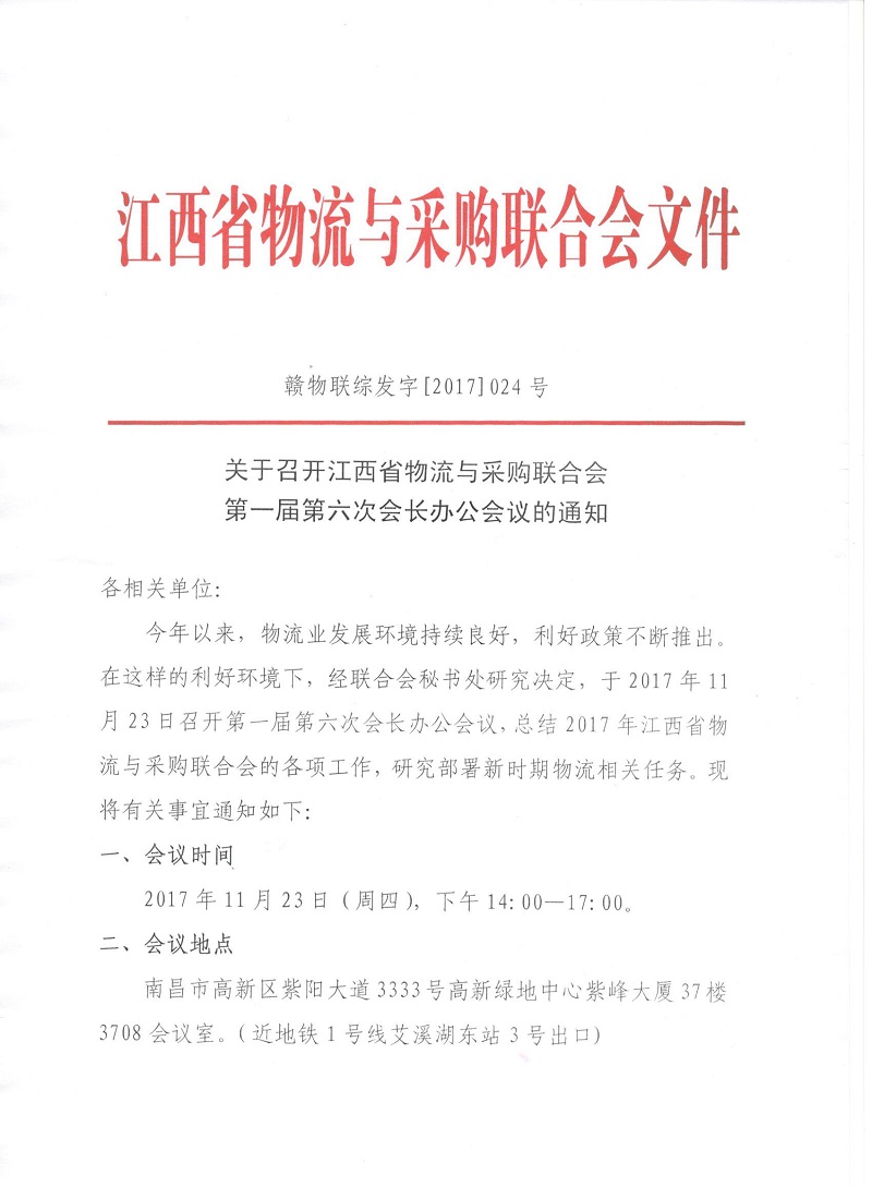 关于召开江西省物流与采购联合会第一届第六次会长办公会议的通知