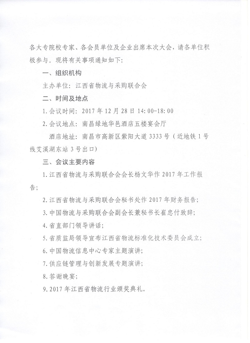 关于召开江西省物流与采购联合会2017工作年会暨江西省物流标准化技术委员会成立大会的通知