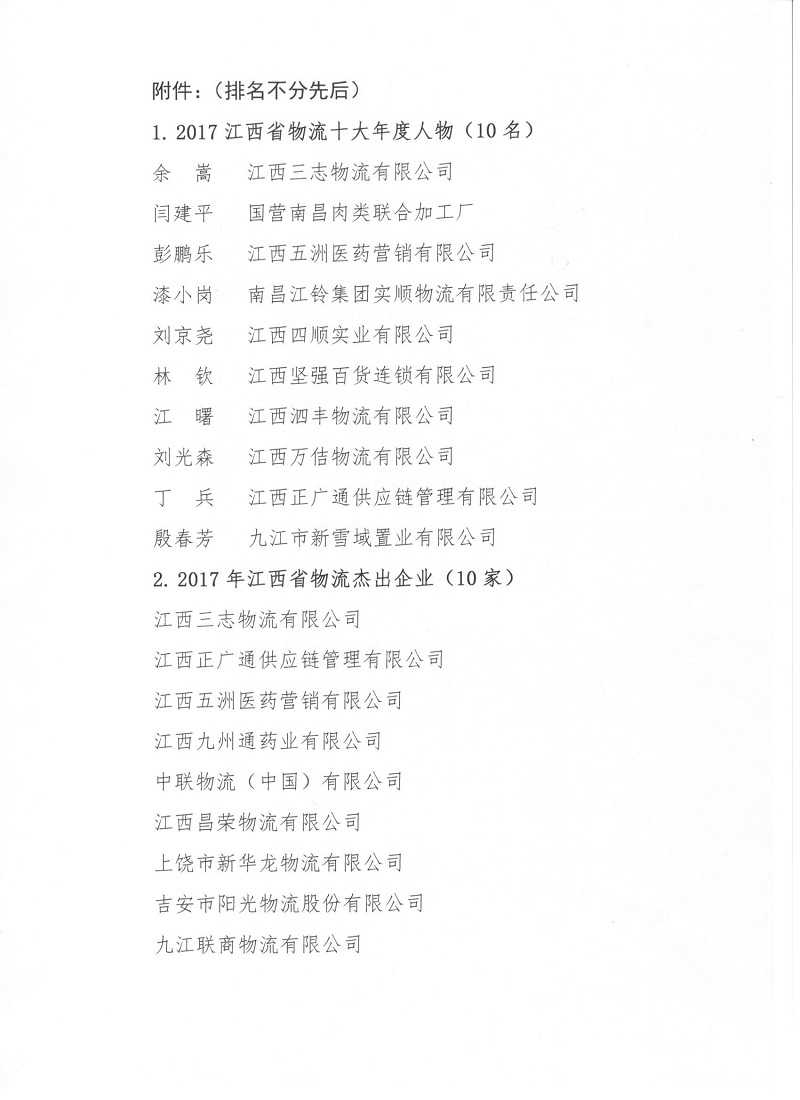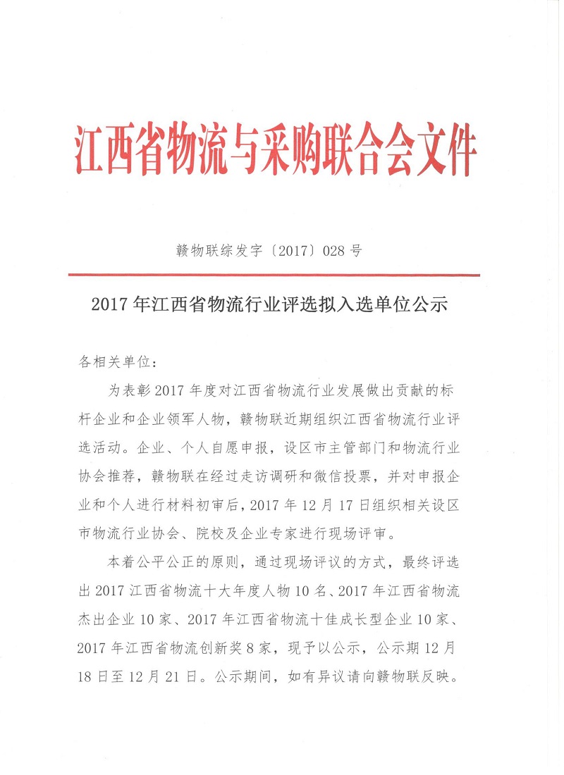 2017年江西省物流行业评选拟入选单位公示