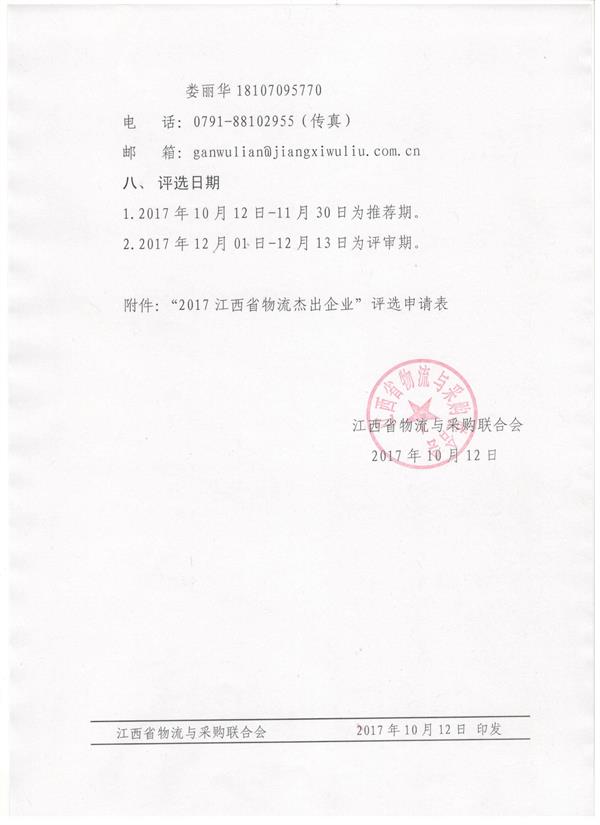 注:请提交申报资料的企业,申请表盖章扫描后,电子版1份发邮箱:ganwulian@www.ncshang.com,纸质版3份邮寄协会。邮寄地址:江西省南昌市高新区紫阳大道3333号绿地紫峰大厦1102室,联系人:梅灵泉,13607045816。
