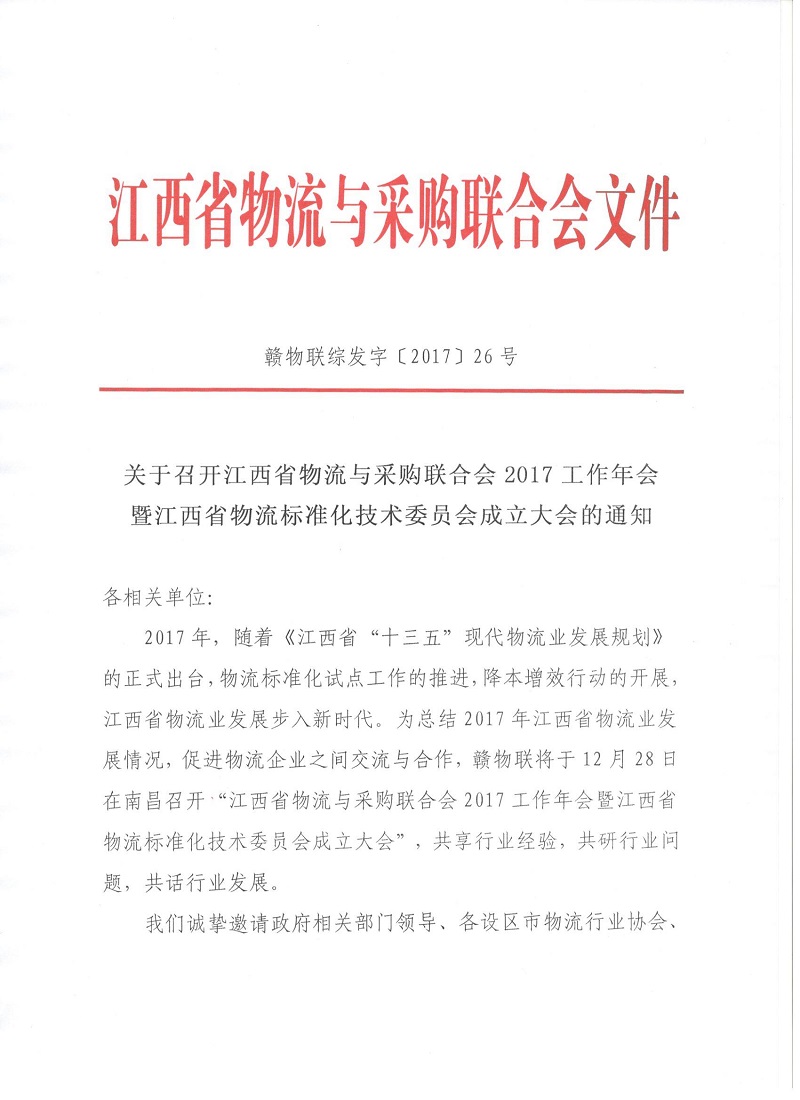关于召开江西省物流与采购联合会2017工作年会暨江西省物流标准化技术委员会成立大会的通知